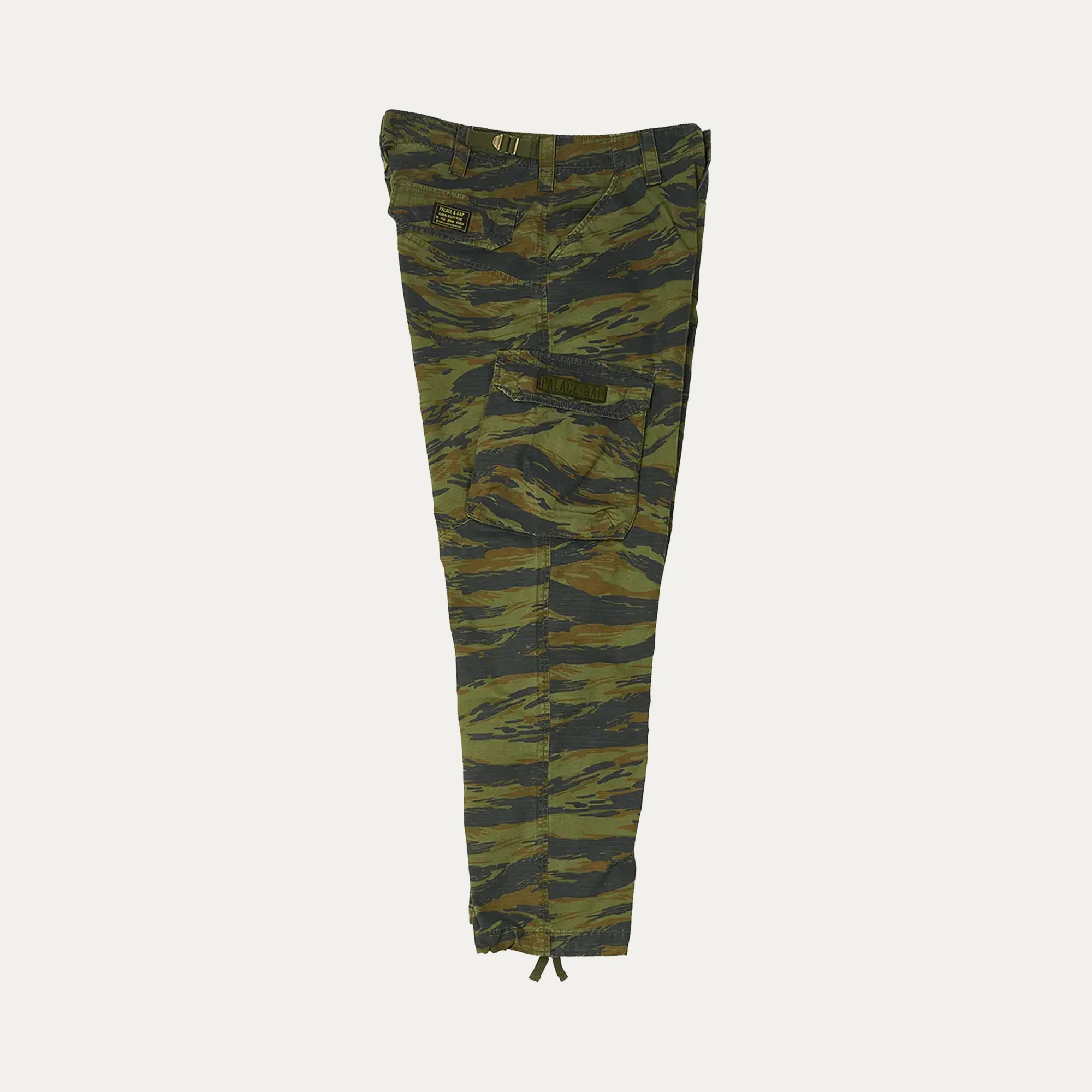 These Palace x gap cargo pants feature a front button fastening, belt loops, and adjustable waist strap. They have two side slash pockets, a logo patch to the side, two side flap pockets, two rear flap pockets, a logo patch to the rear, and a drawstring hem.